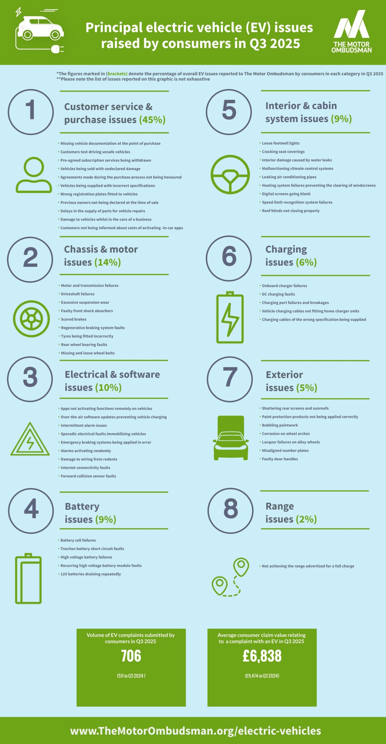 During the third quarter of this year, The Motor Ombudsman logged a total of 706 EV disputes – the highest quarterly tally so far for 2025, and was an equivalent increase of 38% when compared to Q3 in 2024 (511). This is a reflection of the greater number of both new and used battery electric vehicles on UK roads.