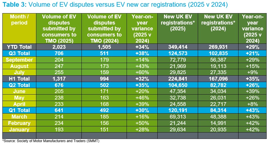 For the third quarter of 2025, the ratio of EV disputes (706) received by The Motor Ombudsman to new EV registrations (124,573) equates to one dispute for every 176 new EVs registered.