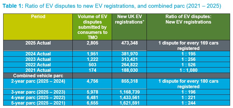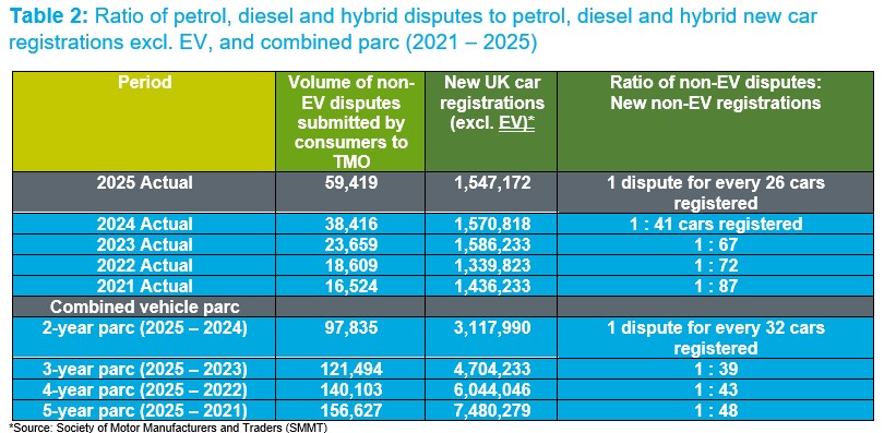 The ratio of non-EV disputes received by The Motor Ombudsman (59,419) to new non-EV registrations (1,547,172) stands at one dispute for every 26 new non-EVs registered.